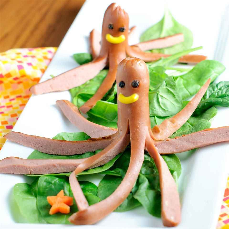Delightful hot dogs shaped like octopuses.